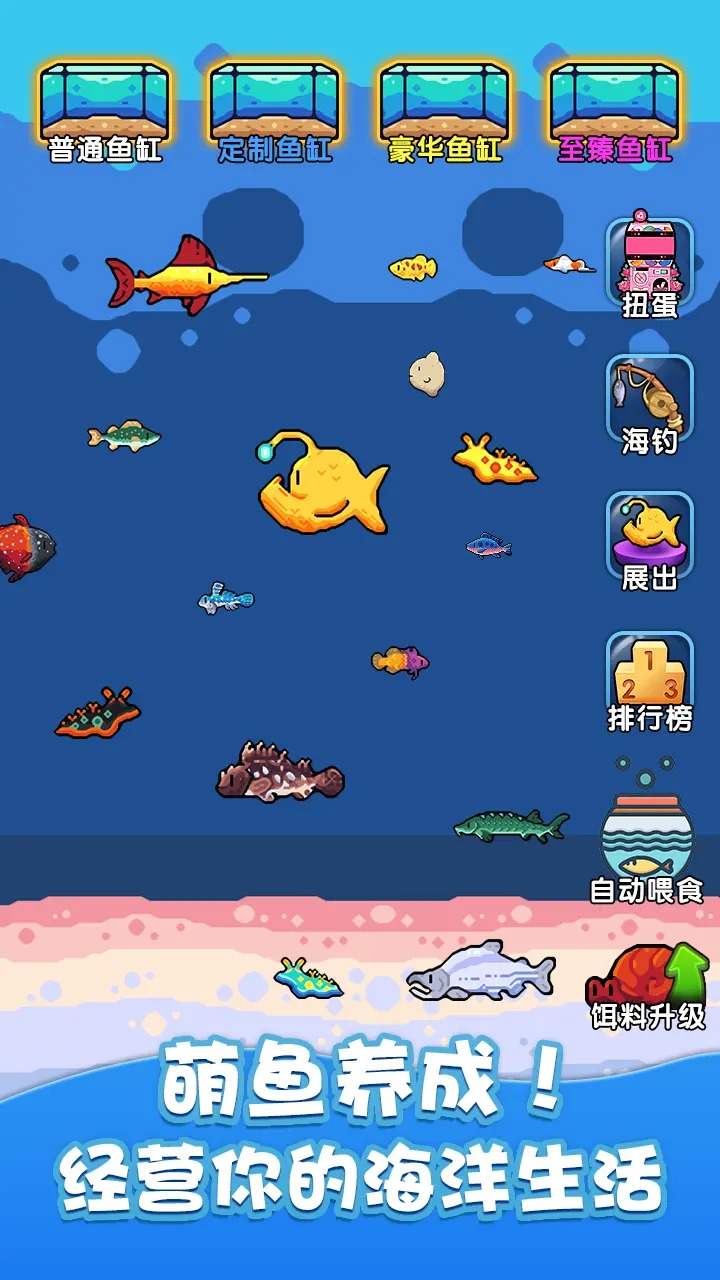 1. 玩家需要先从基础鱼类开始饲养,逐步解锁更高级、更稀有的鱼类。